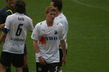 Szene aus dem Heimspiel gegen die Stuttgarter Kickers am 05.04.2008. Christian ist sichtlich sauer über die gelbe Karte, der er gerade erhalten hat.