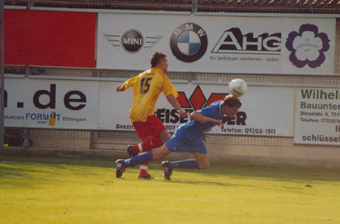 Nicht nur in der Offensive, sondern auch in der Defensive kann ein Flugkopfball effektiv sein. Hier beim Auswärtsspiel in Nöttingen.