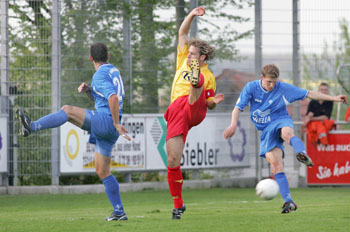 Sieht aus wie Männerballett, doch ist eine Offensivaktion von Christian beim Spiel in Nöttingen. Leider den Ball nicht ganz getroffen, so dass kein Tor gefallen ist. © Herbert Krämer